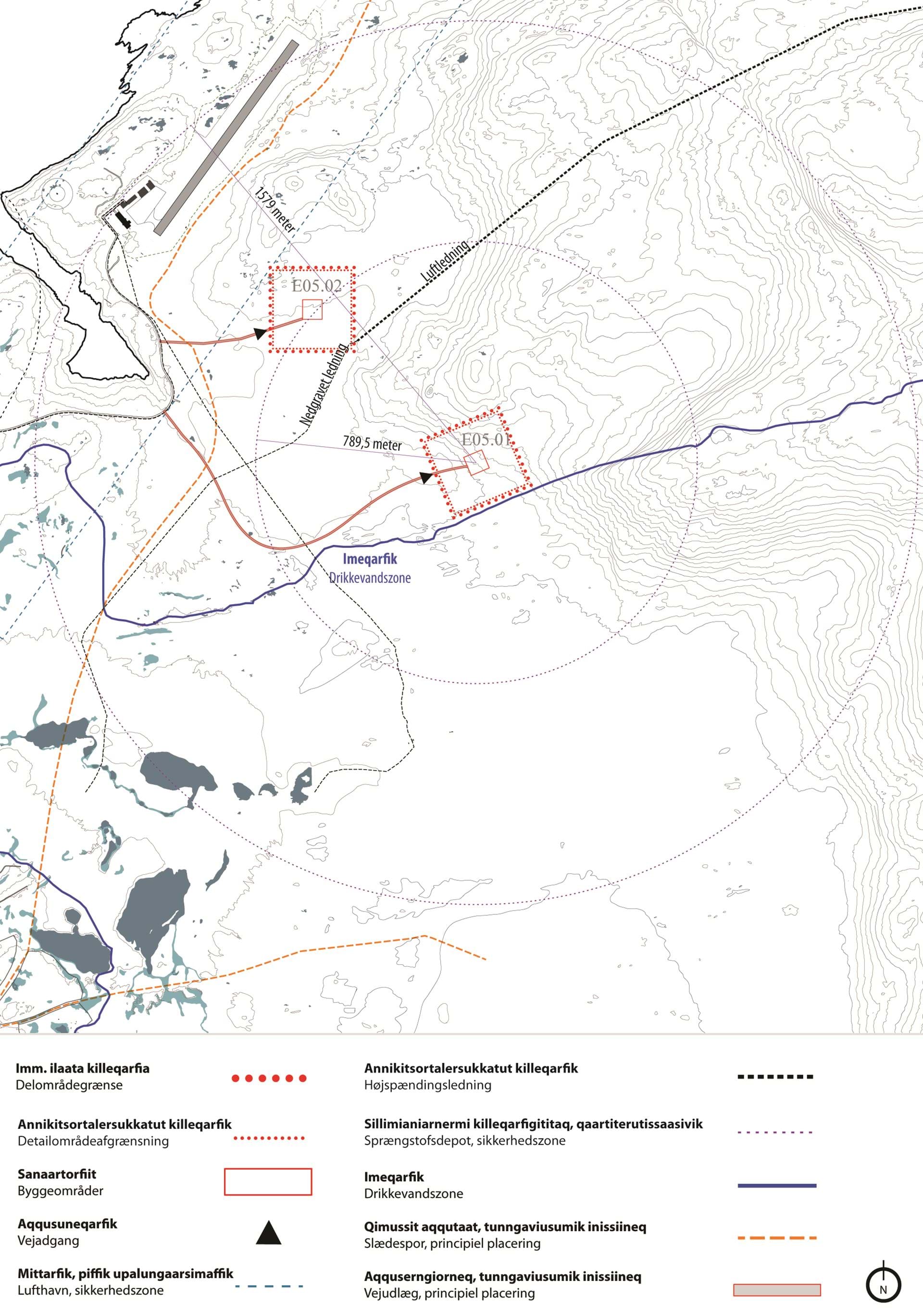 Fastlæggelse af overordnede og detaljerede bestemmelser for nyt delområde for at muliggøre et midlertidigt sprængstofdepot i detailområde E05.1 og E05.2 i forbindelse med anlægsarbejdet for udvidelse af lufthavnen i Ilulissat, samt planlægning for et permanent sprængstofdepot i detailområde E05.1.