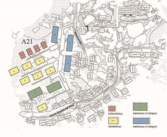 Ændringen indebærer lidt færre byggefelter i forhold til den nuværende lokalplan A21.1, men med en anden placering og størrelse. Nogle byggefelter vil være større end de nuværende og nogle vil være mindre, idet der ønskes en variation af boligtyper med både rækkehuse, dobbelthuse og enfamiliehuse. Der ønskes udlagt 16 byggefelter. I delområdet skal opføres boliger i 1-2 etager med mulighed for forskudte planer.