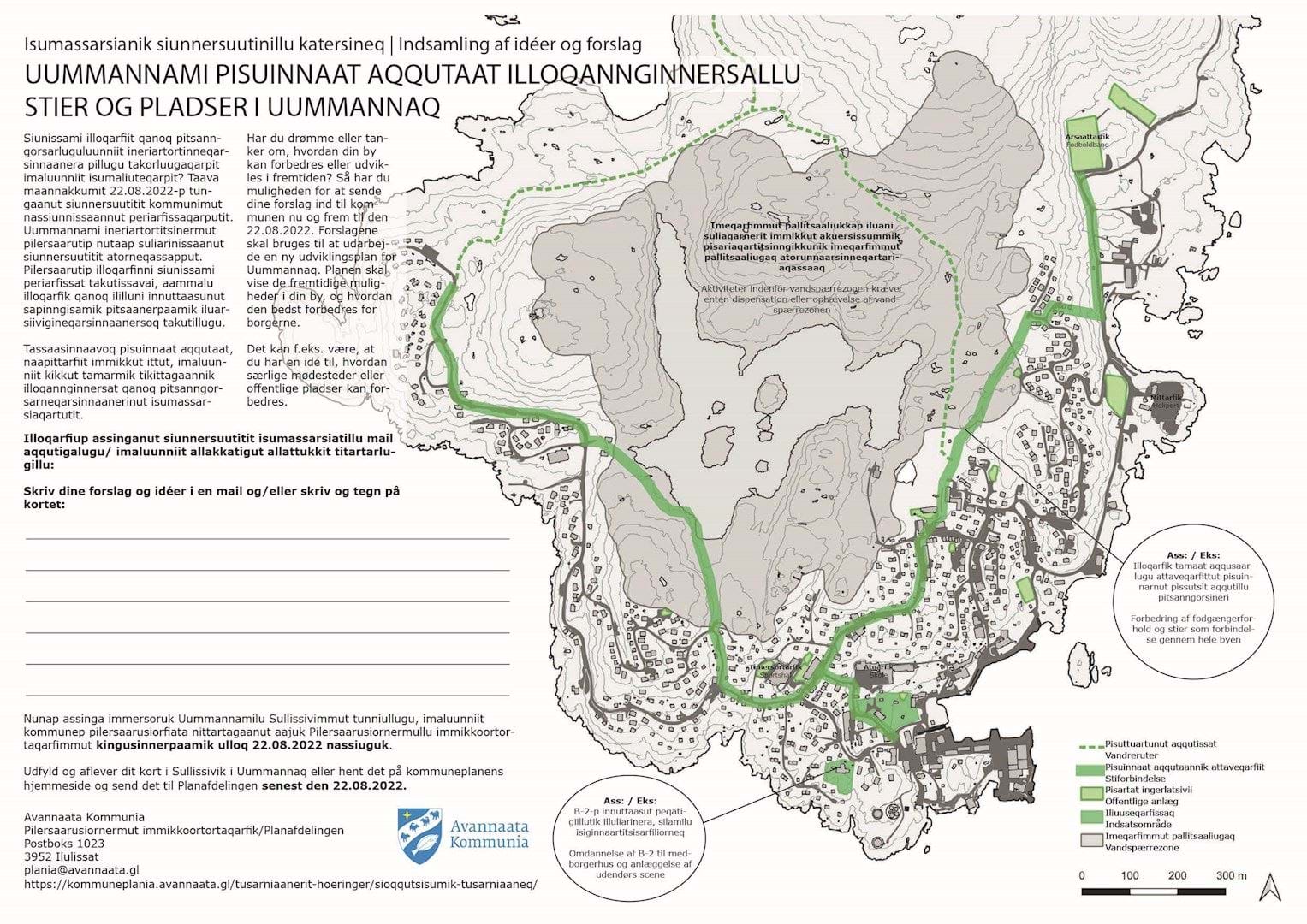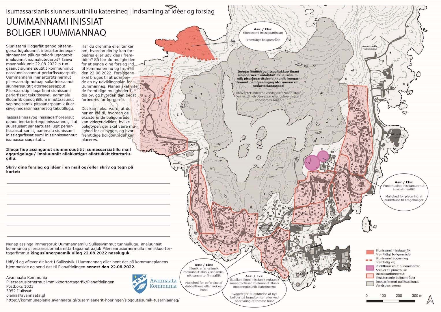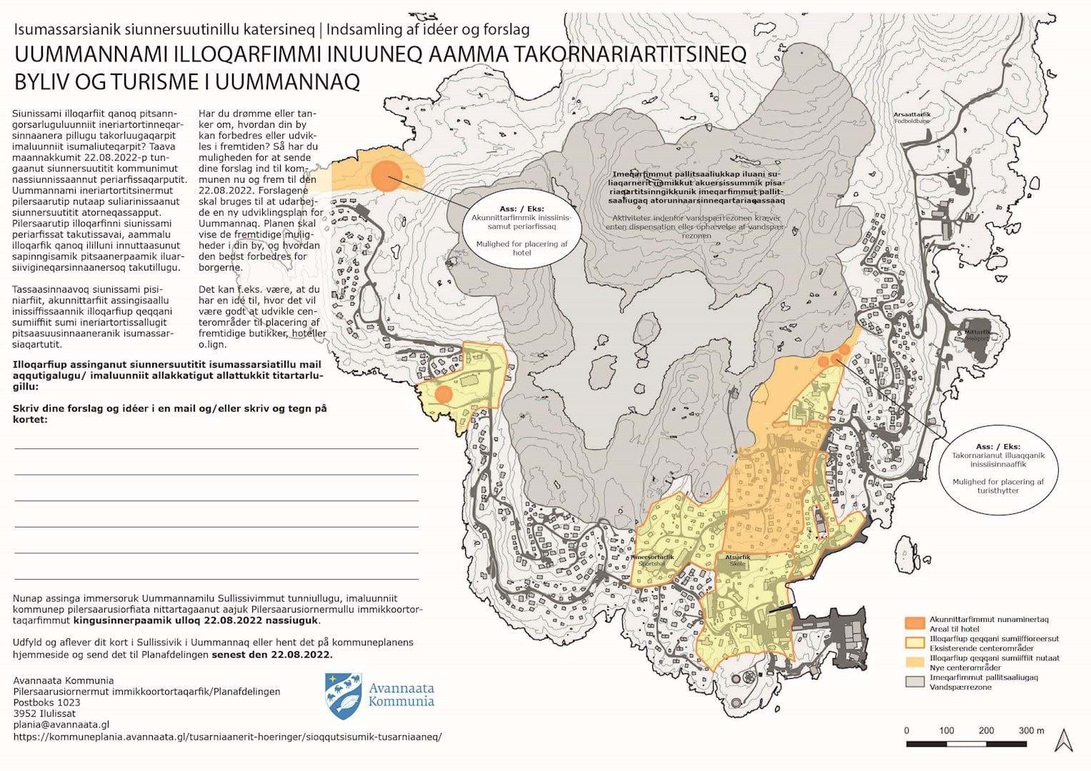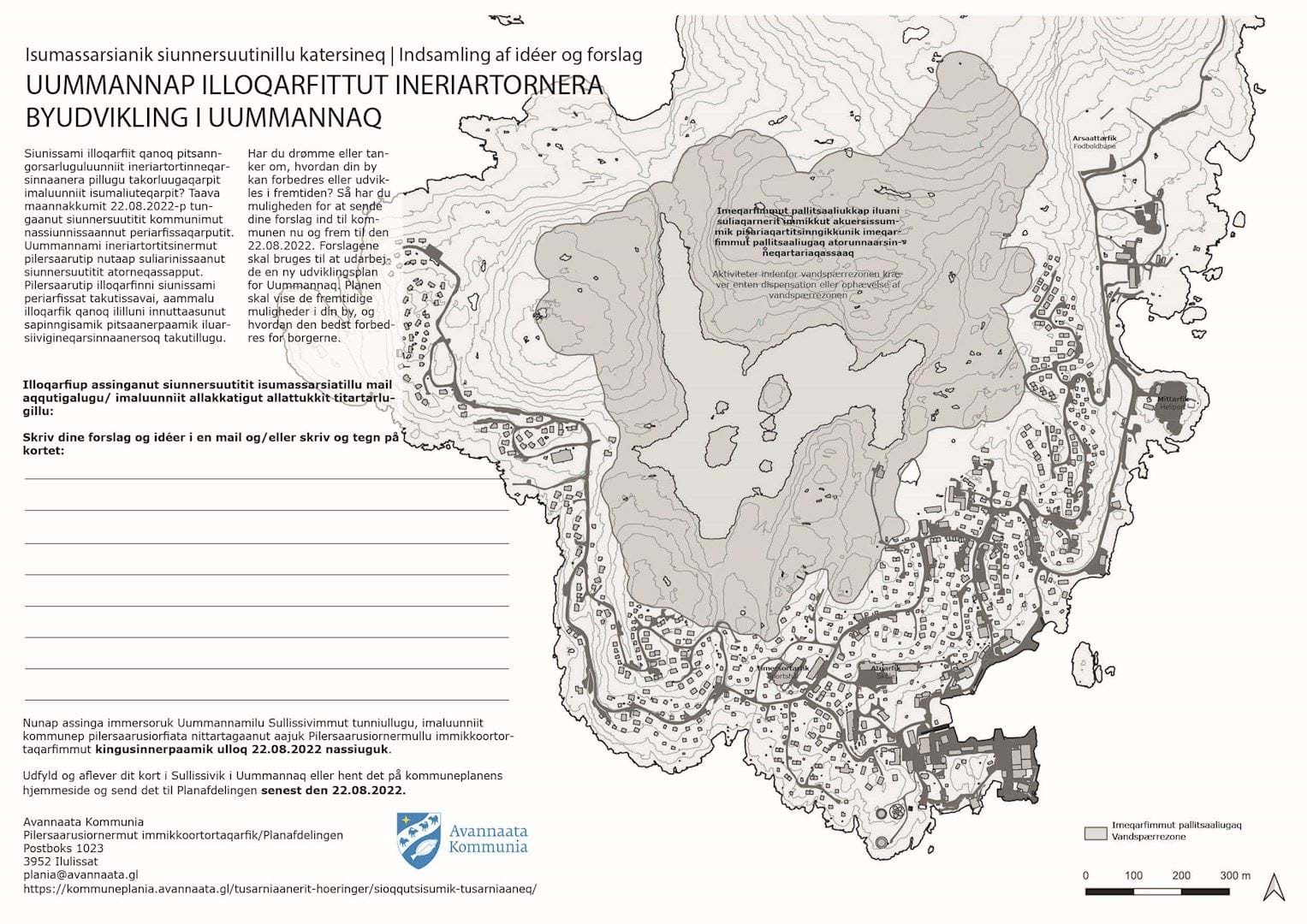 Siunissami illoqarfiit qanoq pitsanngorsarluguluunniit ineriartortinneqarsinnaanera pillugu takorluugaqarpit imaluunniit isumaliuteqarpit? Taava maannakkumit 22.08.2022-p tungaanut siunnersuutitit kommunimut nassiunnissaannut periarfissaqarputit. Uummannami ineriartortitsinermut pilersaarutip nutaap suliarinissaanut siunnersuutitit atorneqassapput. Pilersaarutip illoqarfinni siunissami periarfissat takutissavai, aammalu illoqarfik qanoq ililluni innuttaasunut sapinngisamik pitsaanerpaamik iluarsiivigineqarsinnaanersoq takutillugu.